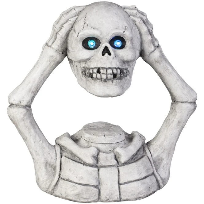 Sie sind auf der Suche nach gruseliger Dekoration, mit der Sie die schaurige Feierlichkeit stilecht einläuten und dem einen oder anderen zartbesaiteten Gemüt einen gehörigen Schrecken einjagen können? Dann haben wir hier genau das Richtige! Das schrecklich-schöne LED-Skelett eignet sich hervorragend, um sich beim Herrichten der vier Wände munter auszutoben und schaurige Akzente darin zu setzen. Dieses besteht aus Magnesia, misst ca. 44,5 x 21,5 x 43,5 cm und ist mit LED ausgestattet, durch welches die Augen in Kombination mit 3x AA Batterien (nicht im Lieferumfang enthalten) schaurig aufleuchten. Aus diesem Grund ist das grausige Skelett das ideale Stück für echte Gruselfans und solche, die nicht genug vom kultigen Halloweenfest bekommen. Also schnappen Sie es sich und lassen Sie die Fantasie frei walten!